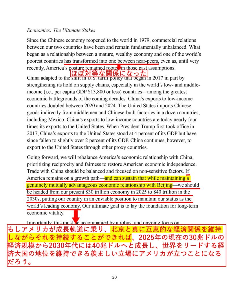 図表5の前半では、米中が「ほぼ対等な関係になった」とし、また後半では「米中が真に互恵的な経済関係を維持していけば、アメリカが強くなる」としている。これは正に、昨年11月2日にCBSの取材を受けたときにトランプが言った「中国を倒すのではなく協力することでアメリカは強くなる」という思考そのものだ。同類のことはNSSの他の個所にもちりばめるように書かれている。
