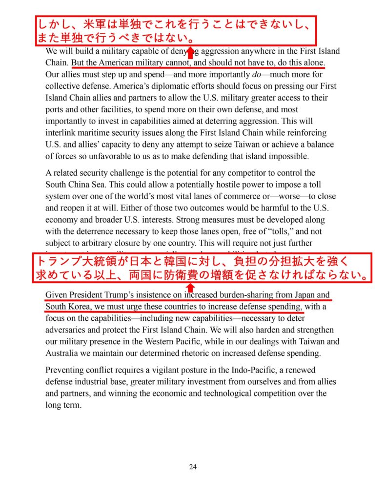 台湾に関しては、「理想的には米軍が軍事力の優位性を維持することにより、台湾をめぐる紛争を抑止することが優先事項ではある」と書くに留め、「理想的には」を入れることにより積極性を抑え、「最優先事項」ともしていない。