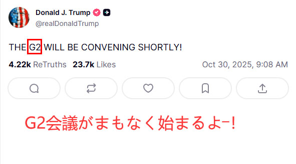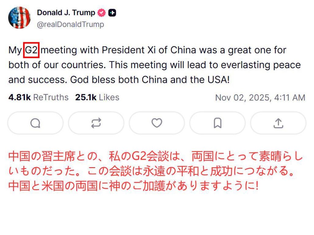 米中首脳会談を終え帰国した後の日本時間11月2日5時11分に、トランプはTruthに投稿し、再び<G2に言及した>。そこには「中国の習主席との、私のG2会談は、両国にとって素晴らしいものだった。この会談は永遠の平和と成功につながる。中国と米国の両国に神のご加護がありますように!」と書いてある。それを図表2に示す。