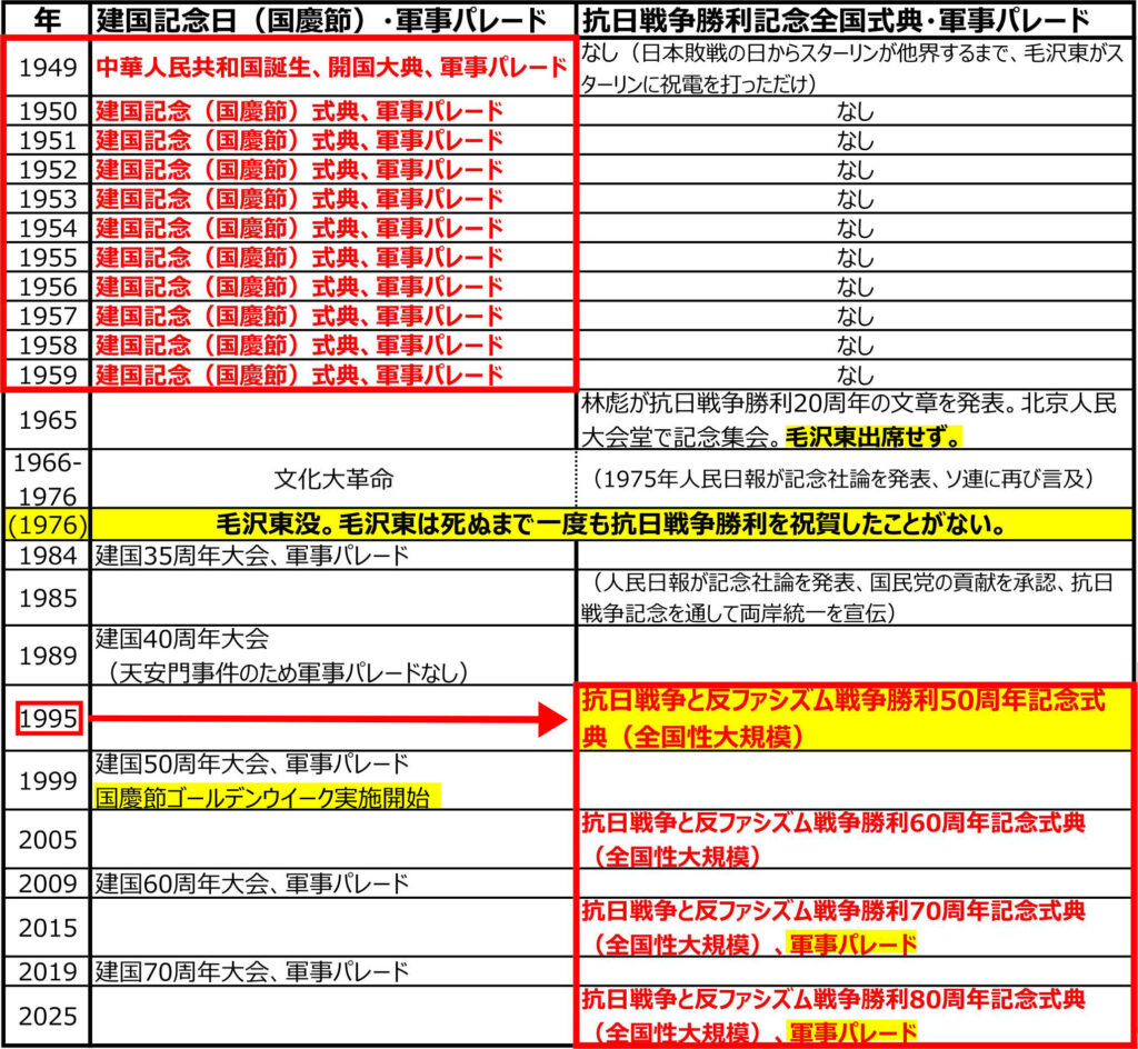 中国建国記念日「国慶節」祝賀と、毛沢東没後に時間を逆行して強調される「抗日戦争勝利記念式典」の比較
