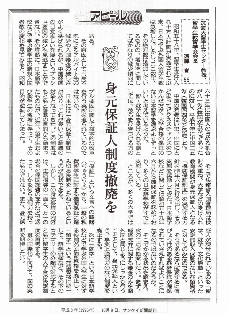 しかし、文化大革命で高等教育機関が閉鎖されていたために学歴に関して日本の大学や文部省あるいは法務省で邪険に扱われ、自殺する者までが続出。たまりかねて筆者は単独北京に飛び、国家教育部に乗り込んで直談判し『中国大学総覧』を著した(1991年)。すると日本全国の大学だけでなく、(当時の)文部省も法務省も拙著に基づいて入国や入学審査をするようになり、やがて法務省の出入国管理局の「就学生受け入れ問題懇談会」のメンバーとして入国審査基準に関する審議を行った。そこで筆者が提案したのが「身元保証人の撤廃」である。