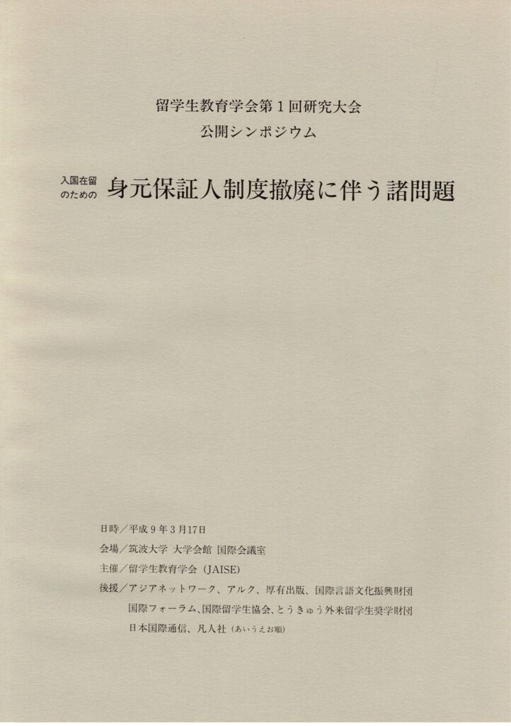 法務省の入国審査の際の身元保証人制度撤廃には成功したが、文部省サイドの身元保証人制度はまだ撤廃されておらず、入国できても大学や日本語学校に入学するときに要求されるので、文部省にも身元保証人制度を撤廃させるべく、図表3にあるように、「法務省、文部省、外務省」の3省代表を呼んで1997年にシンポジウムを開催し、文部省サイドが要求していた身元保証人制度撤廃にも漕ぎつけることに成功した。