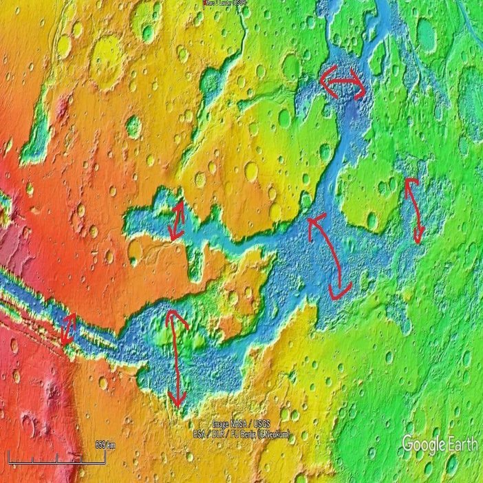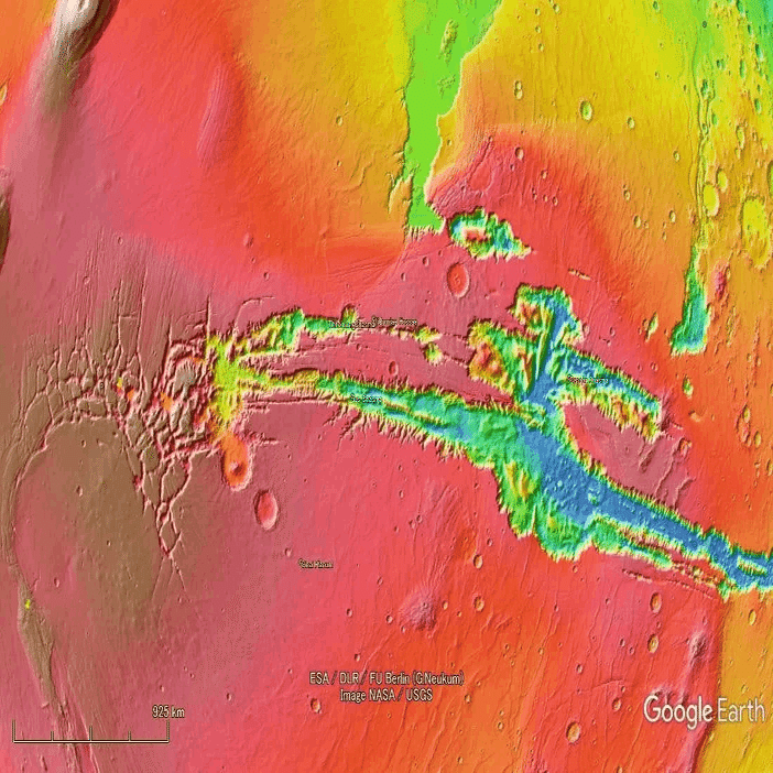 この画像はGoogleEarthで見た火星表面です。マリネリス渓谷は非常に大きな谷地ですが、その形をよく見ると内部から膨らんで地表を覆う薄皮が裂けているように見えます。左に続くひび割れも、膨張した痕跡と考えられます。