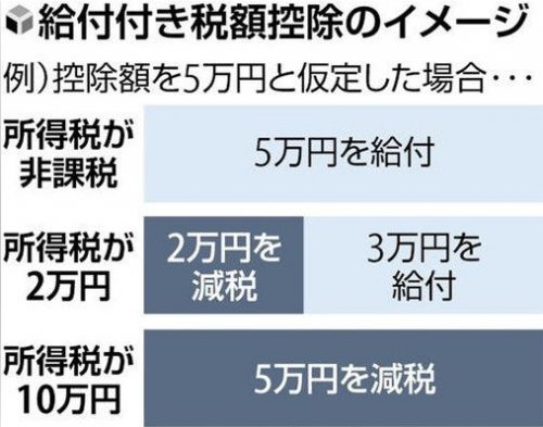 税額控除が5万円の場合、納税額が10万円なら5万円が減税され、納税額が2万円の人は税額がゼロになり3万円が給付される。」