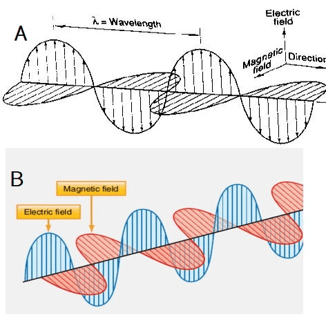 現行の電磁気学では電磁波の伝わり方は、磁場と電場が交互に発生しながら進むと説明される。その説明には2種類あって、電場と磁場が同時に直行しながら進む場合と電場と磁場が90度位相をずらしながら進む、とある。どちらが正しいのか?