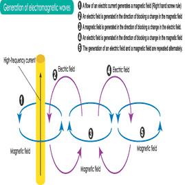 これが正しい理解だ。これを電磁波の伝搬に当てはめると、電場の変化は周囲の荷電粒子を少しだけ移動させ、移動した荷電粒子が反対側に電場を放射する、この繰り返しが電磁波の伝わり方になる。この場合、荷電粒子が動くときに磁場が発生するので、電場と磁場が交互に生まれているように見える。