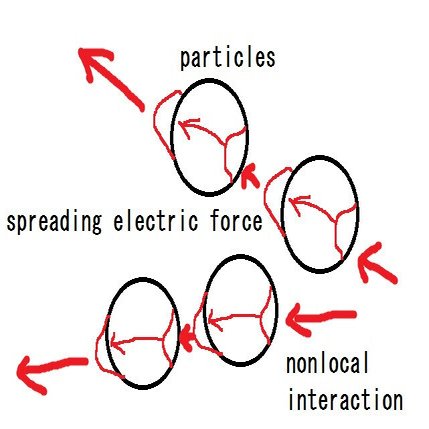 ここで重要な点は、媒質となる粒子と粒子の間は遠隔作用で伝わっているというところだ。遠隔作用と言っても無限大の速さではないことが指摘されている。天文学のトム・ヴァン・フランダーン博士によれば、天文観測の数値から重力の遠隔作用は少なくとも2×10^10c(m/s)であることがわかっている。2×10の10c(光速の200億倍)というのはとんでもなく速いが無限大ではない。おそらく電場の速度も同じ程度であることが予想される。http://www.ldolphin.org/vanFlandern/gravityspeed.html