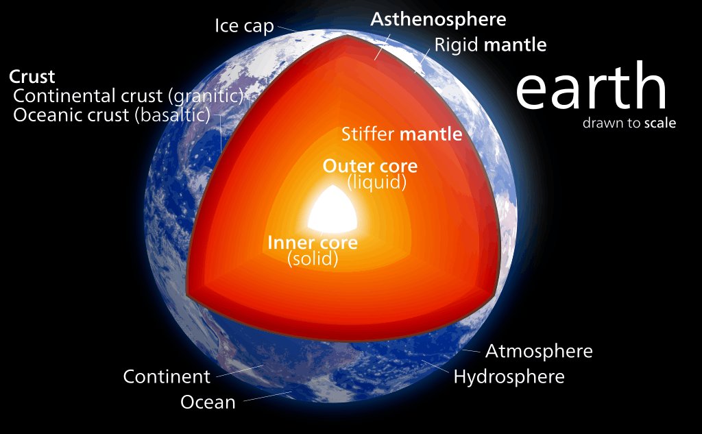 現代科学では、地球は中心に行くほど密度が高くなる岩石と金属で充満していると考えられています。