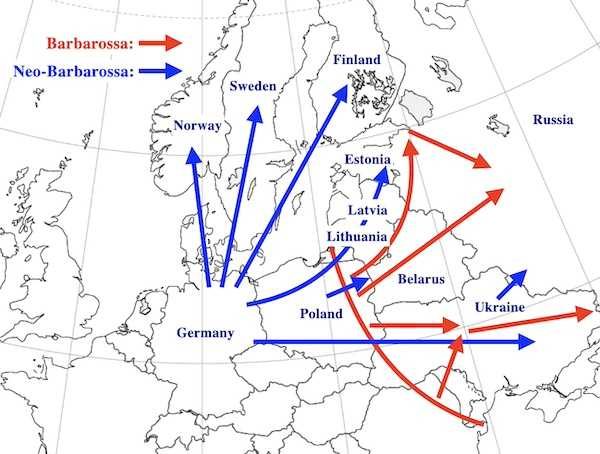 バルバロッサとは、1941年6月22日に300万人以上のドイツ軍がソ連を侵略した軍事作戦。ウクライナとベラルーシを経由してロシアへ攻め込んだ。奇妙なことに、この時、西部戦線に残ったドイツ軍は約90万人にすぎない。ドイツ軍の首脳は西部方面を防衛するために東へ向かう部隊に匹敵する数の将兵を配備するべきだと主張したが、アドルフ・ヒトラーに退けられたという。NATOの東方拡大はバルバロッサの再現にほかならない。(David M. Glantz, The Soviet-German War 1941-1945,” Strom Thurmond Institute of Government and Public Affairs, Clemson University, October 11, 2001)
