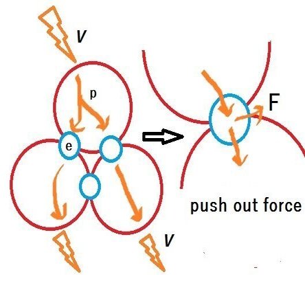結合している電子はわずかに角度がついている。ここをニュートリノが通過するとき、電子を外側に弾き飛ばそうとする力が生じる。十分にニュートリノの衝撃が強いと電子がはじき出され、トリチウムはヘリウム3に崩壊する。