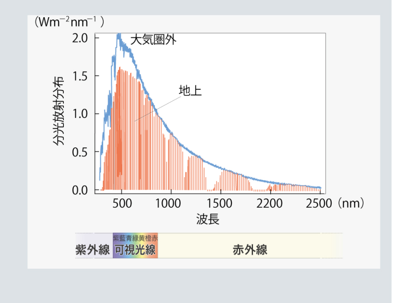 図「太陽光のスペクトル」のように光の強度を波長成分ごとに表したものを「スペクトル」といいます。