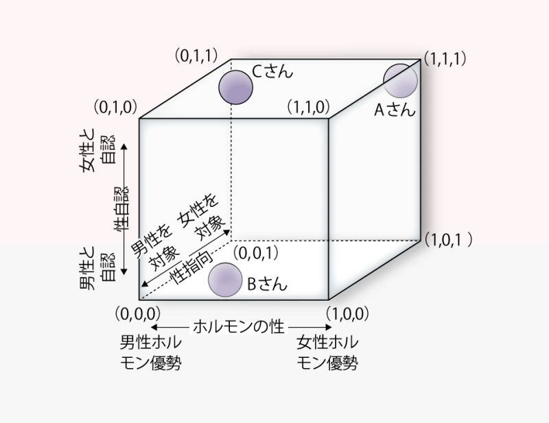 これらのことをあわせると、ヒトの性はn次元のスペクトルとして表せそうです。図「さまざまなヒトの性スペクトラム」は性自認、性指向、性ホルモンの3次元で描かれたもので、従来は(1, 1, 1)と(0, 0, 0)の2つの頂点にほとんどの人が位置していると考えられてきましたが、実際にはAさん、Bさん、Cさんのように、この空間のいろいろなところに私たちは位置していると考えられます。