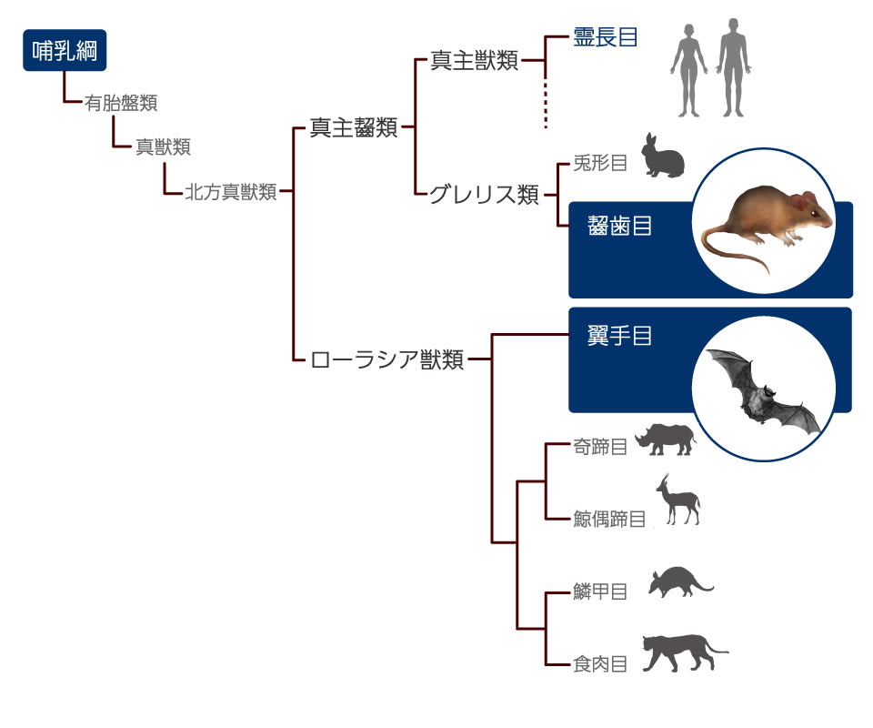 哺乳類のなかで、コウモリの仲間は翼手目というグループに分類されるが、これはネズミの仲間である齧歯目に次いで大きなグループである。