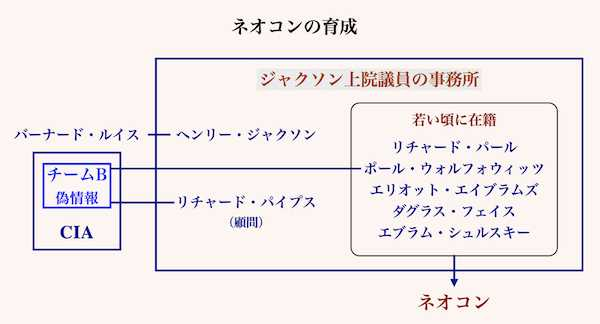 ネオコンとはシオニストの一派で、イスラエル至上主義者でもある。例えば、バーナード・ルイス、リチャード・パイプス、ダニエル・パイプス、デイビッド・ホロウィッツ、ロバート・ケーガン、ポール・ウォルフォウィッツ、エリオット・エイブラムス、リチャード・パール、ポール・ブレマー、ダグラス・フェイス、I・ルイス・リビー、そしてリチャード・チェイニーやドナルド・ラムズフェルドもネオコンと呼ばれている。後にネオコンで中心的な役割を演じる人たちは若い頃、ヘンリー・ジャクソン上院議員の事務所で仕事を覚えている。