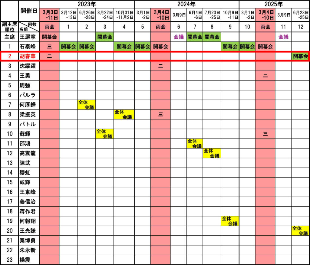 図表1では、両会において開かれる「全国政協」を赤地で縦に染め、年に数回(5回ほど)開かれる「全国政協常務委員会会議」の、「開幕会」の欄を緑色に染め、「全体会議」の欄を黄色で染めた。常務委員会開催の時期を通し番号で「1、2、3…」と記した。