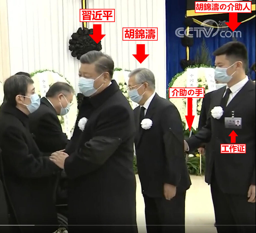 2022年12月5日に江沢民の葬儀に関する映像がCCTVで報道された。その中で目立ったのは、習近平の次に現役ではない胡錦濤が並んでいて、胡錦濤には特別に介助をする人物が付き添っていたことである。それを図表2に示す。