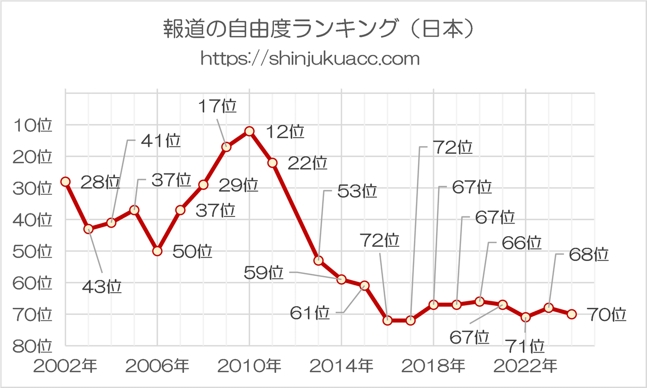 その後、第二次安倍政権が誕生すると、再び大きく落ち込み、その後は日本の報道の自由度は世界70位くらいとなっている。