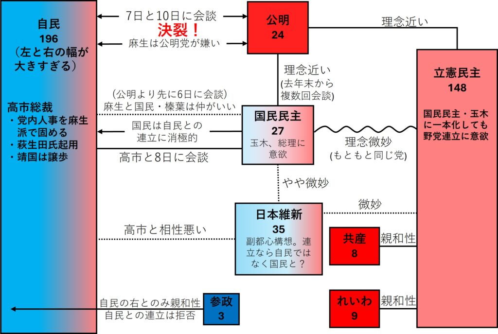 国民民主も、自民党と組めば、連合の支援が得られなくなるので議員が減少する可能性が高く、自民との連立を組む気はない(にちがいない)。