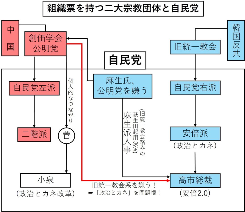図表1の赤色部分は宗教団体・創価学会が母体となっている公明党の自民党内での動きだ。理念的受け皿は自民党内の「左寄りの議員」たちのはずだが、公明党の組織票なしには当選できない自民党議員が多くなってきたので、右も左もなく公明党を支持するようになった。左右の区別なく「個人的つながり」として自民党と公明党を結び付けた議員の中には、現存では菅元総理などがいる。菅氏は総裁選のときには小泉候補を支援していたので、「個人的つながり」として小泉氏は公明党と繋がっているが、麻生氏の策略により小泉氏は落選し高市氏が総裁に当選した。