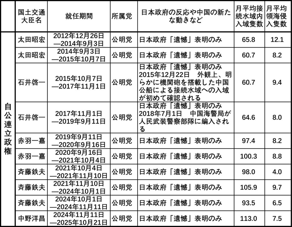 図表:近年の国土交通大臣の名前と政党および尖閣諸島における中国船舶の現状と日本政府の対応など