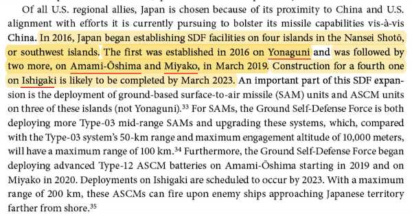 日本では中国やロシアを意識した戦争の準備が進む。例えば、自衛隊は2016年に与那国島でミサイル発射施設を建設、それに続いて2019年には奄美大島と宮古島、そして23年には石垣島でも施設を完成させた。こうした施設建設の理由をアメリカ国防総省系のシンクタンク「RANDコーポレーション」が2022年4月に発表した報告書で説明している。こうした設備の建設はGBIRM(地上配備中距離弾道ミサイル)で中国を包囲するというアメリカ軍の計画に基づいているのだ。