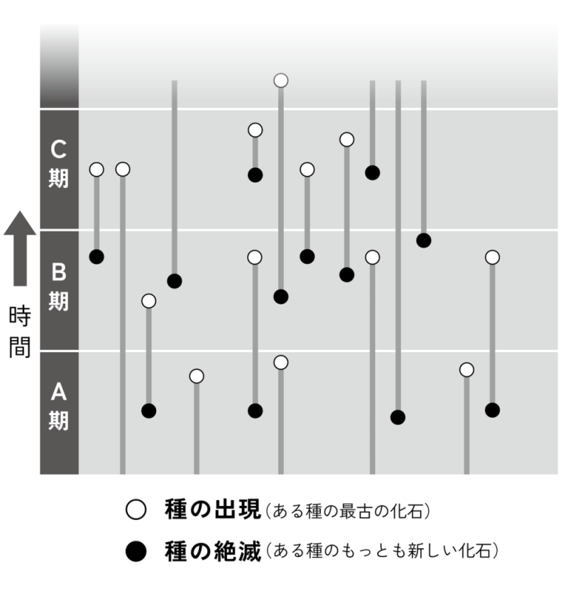 下の図、A期、B期、C期という3つの時代における、仮想的な化石記録である。