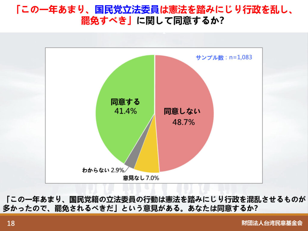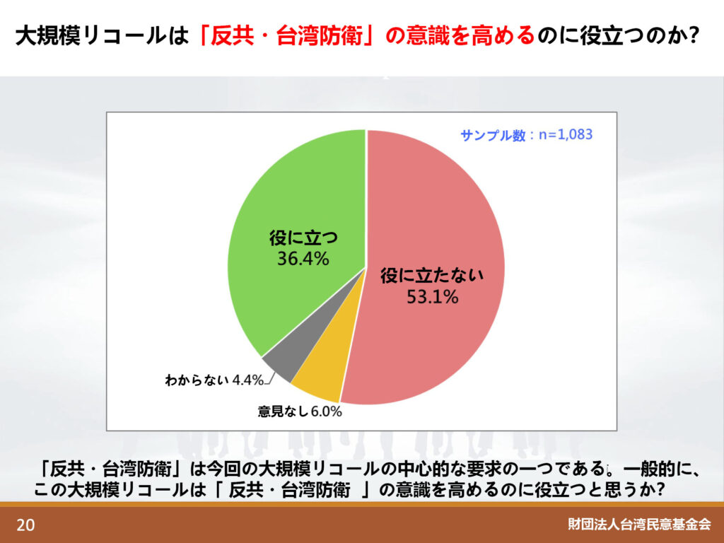 頼清徳総統が支援する市民団体は、国民党議員を罷免することによって「反共・台湾防衛」が果たされると主張しているが、これには無理がある。頼清徳総統として、何としても議会における最大野党・国民党の議席数を減らし、結果的に「少数与党」である民進党の議席数を相対的に増やそうということが目的なのであって、そのような政争のために選挙で選ばれた国民党議員の特定の議員を意図的に選んで罷免しようということ自体が邪道だ。リコールが「反共・台湾防衛」に役立つと思わない人が53.1%もいるというのは、もっともなことだろう。