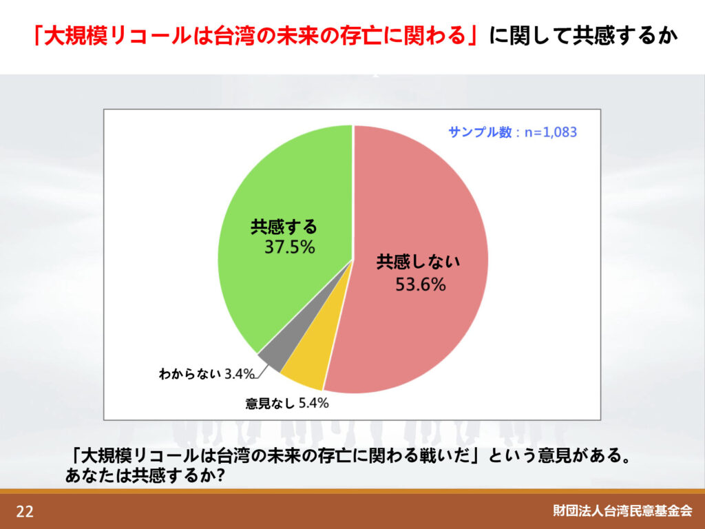 今年7月15日、財団法人「台湾民意教育基金会」は<大罷免(=大規模リコール)、国家アイデンティティと台湾民主>というタイトルで世論調査の結果を発表した。